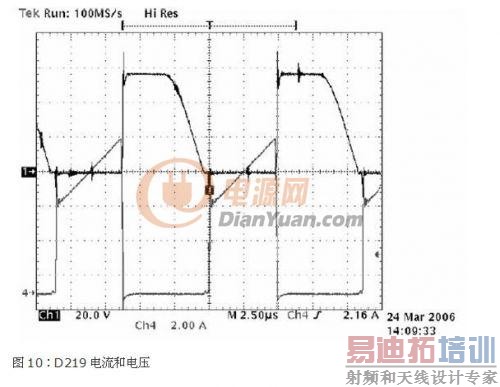 当MOSFET 导通时,漏极电压有机会接近最低值,但由於励磁电感的高误差(+/-30%)这可能因不同电路板而异。图10 的二极管波形清楚地显示了当二极管关闭时的寄生振荡。