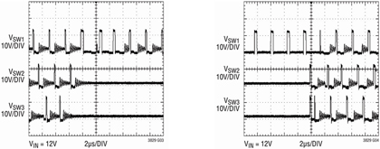 当内置反馈误差放大器的输出电压达到用户可编程电压时,就触发逐级递减操作模式。在这个编程电压上,该控制器关断它的一个或多个相位,并阻止功率 MOSFET 的接通和断开。这种能设置何时触发逐级递减操作模式的能力带来了能决定何时进入这种操作模式的灵活性。图 4 中显示了 SW 波形以及 LTC3829 怎样进入和退出逐级递减操作模式。