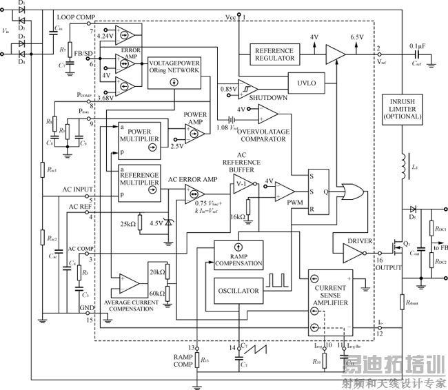 同时,这个高频电流镜像器通过一个15kΩ的电阻给缓冲放大器提供一个电压信号;另外,这个高频电流镜像器的PWM输出直接给PWM发生器提供一个信号,这样就可以来控制开关管的驱动信号。当PFC电路工作轻载时,通过管脚12给芯片一个相应的电压信号,它就会及时驱动高频电流镜像器,从而就会对采样的电压信号进行补偿,增大了这个采样信号,这样就可以很好地跟踪参考信号,以提高轻载下PFC电路的功率因数。