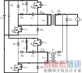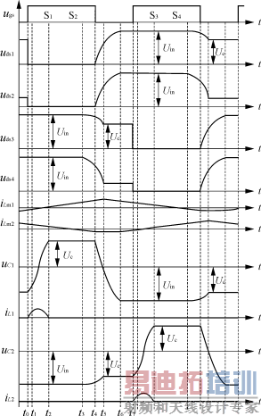 S1,S2继续开通。 L 2相对 L m2很小,在此可忽略。变压器T2原边励磁电感 L m2,漏感 L lk2,S3与S4的结电容 C s3, C s4和 C 2及D7经 U in谐振。从电路结构上可以看出, C 2和S3的结电容 C s3相当于并联,且 C 2比结电容 C s3大很多,所以S3上的电压下降速度要比S4的慢很多。