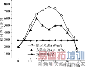 由典型日运行数据可以看出,系统瞬时工作电压基本跟踪在296V附近,并随太阳辐射强度和组件温度的变化而漂移。分析表1的数据发现,当太阳辐射强度为730W/m2,组件温度50℃,方阵工作电压296V时,方阵工作电流达6.4A。而当太阳辐射强度为830W/m2,组件温度58℃,方阵工作电压298V时,方阵工作电流为6.0A。方阵工作电流随太阳辐射强度的增加反而减小,反映了系统瞬态工作点偏离了最大功率点。图2为某典型日太阳辐射强度、方阵工作电压和工作电流的瞬时变化。由此可进一步看出,在方阵工作电压基本恒定的情况下,方阵工作电流开始随太阳辐射强度的增加而线性增加,当达到某一值时随太阳辐射强度的增加反而下降。当太阳辐射强度减小时,方阵工作电流开始略有增加随后线性下降。在太阳辐射较强的时段方阵工作电流出现反常现象。这是因为随组件温度的升高方阵伏安特性变差,CVT不能适应这种瞬态变化使系统偏离最大功率点,导致功率损失。