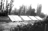 太阳电池方阵安装方位为南偏西10°,倾角30°~55°可调。逆变控制器置于泵站室内阴凉、通风、干燥处。潜水泵置于机井内动态水位以下15m,出水管采用法兰连接。系统安装完成后,先检查太阳电池方阵的输出电压,再将四组太阳电池方阵逐一并联接入逆变控制器,启动逆变器驱动电机进行运行实验,采集数据。图1为现场太阳电池方阵实物照片。