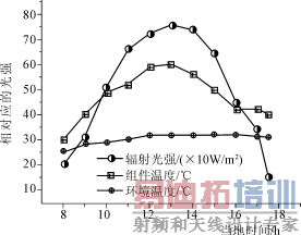 | 当地时间/h | 辐射光强/(W/m2) | 方阵电压/V | 方阵电流/A | 组件温度/℃ | 环境温度/℃ |