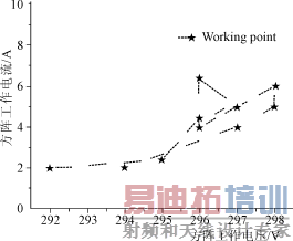 图3为组件温度随太阳辐射强度的瞬时变化情况,由此可看出环境温度基本恒定,组件温度随太阳辐射强度的变化近似线性变化,当环境温度30℃,太阳辐射强度为750W/m2时,组件温度达60℃,太阳辐射强度和组件温度的变化导致系统工作点的漂移。图4为典型日系统瞬态工作点变化情况。综合分析可知,夏季在太阳辐射较强的时段工作电压设定在296V偏高,不能使系统有效地工作。