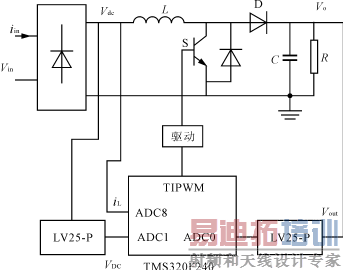 在电力电子装置中,DSP主要完成主电路控制、系统实时监控及保护、系统通信等功能。应用的具体电路包括UPS逆变控制电路、交流电机调速电路、功率因数校正电路和谐波抑制电路等。文献[4]研制了一种1~2kVA小型单相在线式UPS,采用以TMS320F240(包含专用PWM产生电路、两路10位A/D采样通道、28个复用I/O口)为核心的数字化控制电路,完成系统级控制和逆变器(开关频率为20kHz)控制。仿真和实验表明,电路输出稳定、动静态特性良好。DSP在系统中还承担数字锁相、检测、显示控制以及与上位机的通信功能。文献[5]介绍了利用TMS320F240型DSP控制电机运行的实现方法。F240具有20MIPS的高速处理能力和面向电机控制的专用外围设备,能实时产生空间向量对称PWM波形,实现包括电流环在内的全数字调制。文献[6]介绍了采用由DSP和微处理器构成双PWM控制的变流器的工作原理和硬件构成,电路具有结构简单、控制灵活、实时性好、功率因数高等特点,对谐波具有非常好的抑制效果。文献[7]用DSP芯片TMS320F240实现了输出功率为2kW的单相PFC电路的数字控制。图2为控制系统原理图,开关频率为33kHz。实验测得功率因数0.994,效率95%。