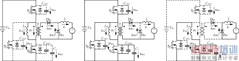 根据以上的分析可以看出,S1及S3为一对互补开关,两者寄生输出电容上的电压 v ds1与 v ds3之和等于输入电压 V in。因此,当其中 v ds1(或 v ds3)等于零时, v ds3(或 v ds1)就等于 V in,可见开关S1及S3的电压应力均为输入电压。