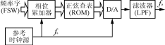 首先,将单位振幅正弦波的相位在2π弧度内分成2A个点(即最小相间隔θmin=2π/2A)经离散量化后存入ROM,构成正弦表。通过相位累加器把频率码变换成相位取样值。在时钟(基准频率)控制下,相位累加器以Δθ(=nθmin,n=1,2...)为增量递增,其输出的相位数据对ROM寻址,查出的函数值经D/A变换器变换成量化正弦波,经低通滤波器可得正弦波电压。最后输出频率为