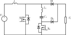 在每次S导通前,先导通S1,使辅助谐振网络谐振。当S两端电容电压谐振到零时,导通S。当S完成导通后,立即关断S1,使辅助谐振电路停止工作。之后,电路以常规的PWM方式运行。该拓扑结构在不