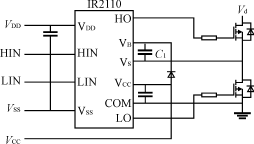 由于所采用的专用驱动芯片IR2110是通过自举供电方式来驱动桥臂上管的(如图4所示)。所以,在上、下管驱动信号恒低或恒高时,给上管供电的自举电容C1能量得不到补给。当电容上的能量放完后,上管关断,就会出现此桥臂无驱动信号,无输出的现象。尤其是直流电压时,常有这一现象。