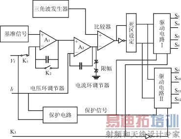 在此电源系统中,电压源和电流源的控制采用同一控制电路,通过继电器切换到不同的工作模式。电压源工作时,继电器K1合,K2开(如图3所示),采用电压、电流双环调节控制,基准信号为正弦信号,输出交流电压;基准为直流电平,输出直流电压。电流源工作时,K1开,K2合,电压调节环变为跟随器,只通过电流环调节,基准为正弦信号,输出交流电流;基准为直流电平,输出直流电流。电压源和电流源驱动信号切换是通过K3来实现的,在电压源工作方式,关断电流源的前级;在电流源工作方式,关断电压源的前级,这样可以防止干扰,提高电路的可靠程度。以上的K1、K2、K3是由数控电路给出的。