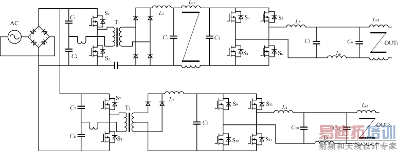 电源主电路如图1所示,分上下两部分,上部分为电压源部分,下部分为电流源部分,每部分采用两级结构,交流输入整流滤波后,先经过DC/DC变换,再通过逆变器输出。其中DC/DC采用半桥电路用来提供稳定的直流母线电压,并隔离输入级和输出级。逆变部分采用了常规全桥逆变电路,适合于较大功率的应用场合。输出采用两级LC滤波器滤除高频纹波。Lc1、Lc2、Lc3是共模抑制器。电压源前后级的高频开关动作很容易引起两级间的互相干扰,在母线电压比较高的时候尤其明显。因此在两级之间串接共模抑制器Lc1,用来隔离其相互间干扰。Lc2,Lc3接在输出端和负载之间的,作用和Lc1类似,用于抑制高频共模分量通过负载。所不同的是电压源前级DC/DC采用全桥整流,电流源采用全波整流。
