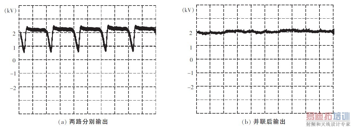 通过小功率试验的验证,证明了该方案的可行性,采用本方案可以在较低的工作频率下达到输出低纹波直流电压的目的,可以减小半导体开关元件的损耗,提高元器件使用寿命和设备的稳定性,同时对控制等辅助电路的要求也降低;另外并联后输出电压的脉动频率高且幅值小,容易滤波,所以可以减小输出端的滤波电容。由于电路是两路电源并联的结构,可以提高电源的输出容量。