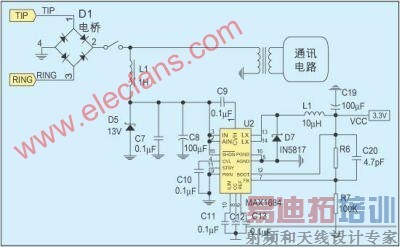 摘机馈电电路大致分为两类,馈电电路与通讯电路并联的属于并联馈电,馈电电路与通讯电路串联的属于串联馈电。图2是一种常用的并联馈电电路,大电感L1保证直流馈电不会影响交流信号。对于恶劣的线路状况,如5km长的用户线路,若不考虑通讯电路的影响,齐纳管D5上的电压最大为15V,功率可达340mW。当线路状况更加恶劣时,将齐纳管D5上的电压降低到13V,则可获得300mW左右的功率。利用MAXIM公司的开关频率为 600KHz,效率可达95%的高效DC/DC转换器MAX1685,将这个电压转换成3.3V就可获得85mA的电源电流。