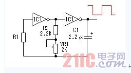 这里采用六反相器CD4069构成方波信号发生器。电路中R1是补偿电阻,用于改善由于电源电压的变化而引起的振荡频率不稳。电路的振荡是通过电容C1充放电完成的。其振荡频率为f=1/2.2RC。图示电路的最大频率为:fmax=1/2.2×3.3×103×2.2×10-6=62.6Hz;最小频率fmin=1/2.2×4.3×103×2.2×10-6=48.0Hz。由于元件的误差,实际值会略有差异。其它多余的反相器,输入端接地避免影响其它电路。
