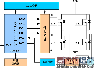 增量编码器接口使用SPMC75F2313A内部的PDC定时器实现,为SPMC75F2313A内部固化的电机驱动模块提供位置和速度信息,从而完成系统的速度和位置控制。