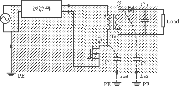 参照图3,由式(2)可得,共模电流 I cm1及 I cm2的幅值与两电气节点①与②处d v /d t 和对PE(安全地)的分布电容 C d1和 C d2的积成正比。图中节点①是MOS管漏极与变压器原边的连接点,节点②为变压器二次侧与输出二极管的连接点。共模电流辐射强度与共模电流围绕回路面积有关,也就是说,电磁辐射强度和电流环路面积成正比,这里环路面积用阴影面积表示。因此,减弱共模辐射耦合应从3个方面入手,即减小d v /d t ;减小分布电容;减小共模电流环路面积。