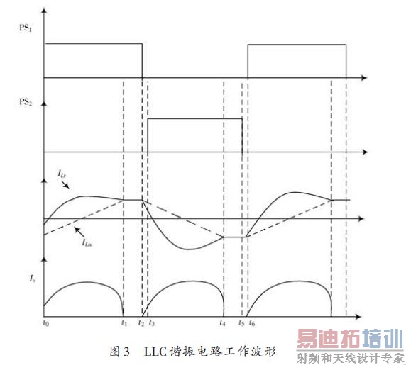 LLC电路根据开关频率范围可以分为四种模式,本文只讨论fr>fs>fm 模式下的工作原理,一个开关周期内整个工作过程如下所述,工作波形如图3所示,PS1 ,PS2 分别为Q1 ,Q2 的驱动脉冲波形: