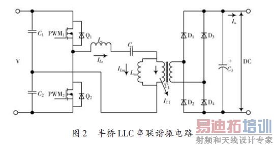 本文采用了一个半桥LLC串联谐振电路,如图2所示。半桥LLC 串联谐振电路包含输入电容C1 、C2 ,MOSFET Q1 、Q2 ,谐振电感Lr ,谐振电容Cr ,变压器T1 ,输出整流二极管D1 ~ D4 和输出电容C3 .