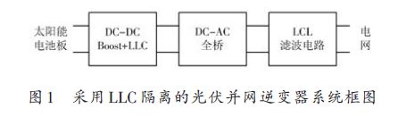 采用LLC隔离的光伏并网逆变器结构如图1所示,它包括DC-DC 直流升压级和DC-AC 逆变级两级结构,前级负责对太阳能电池阵列传送过来的直流电进行升压和最大功率跟踪,后级负责对前级传送过来的直流电进行逆变,最后经过滤波电路后进行并网。