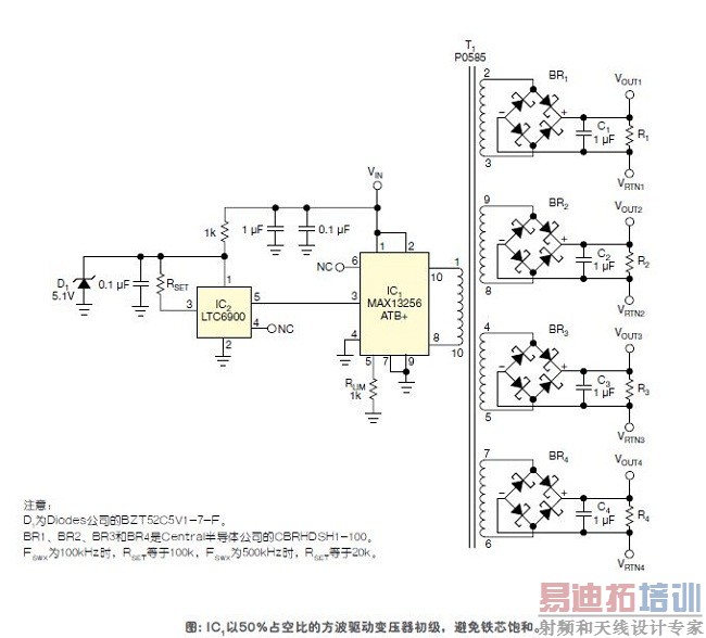 美信半导体生产的MAX13256H-桥电路变压器驱动器(IC1)最适合用于此类应用。它包含一个独立的变压器隔离DC-DC转换器所需要的全部功能。其内置FET可承受36V电压,并配置为两个独立的推挽式输出,以精确的50%占空比驱动变压器的初级,避免了铁芯饱和。该驱动器还包含可调的、强健的内部限流功能,从而为输出提供短路保护,且在故障排除之后能够完美地恢复。该驱动也包含欠压锁定(UVLO)功能,在输入电压过低时阻止开关活动。