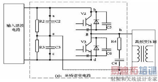 如图所示,C2、C3、V2、V3组成的半桥逆变电路,V2、V3为IGBT、MOSFET等开关元件,在V2、V3开通和关断时,由于开关时间很快以及引线电感、变压器漏感的存在,回路会产生较高的di/dt、dv/dt突变,从而形成电磁干扰,为此在变压器原边两端增加R4、C4构成的吸收回路,或在V2、V3两端分别并联电容器C5、C6,并缩短引线,减小ab、cd、gh、ef的引线电感。在设计中,C4、C5、C6一般采用低感电容,电容器容量的大小取决于引线电感量、回路中电流值以及允许的过冲电压值的大小,LI2/2=C△V2/2公式求得C的大小,其中L为回路电感,I为回路电流,△V为过冲电压值。