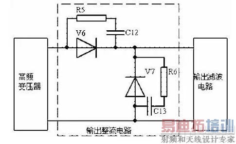 如图所示为输出半波整流电路,V6为整流二极管,V7为续流二极管,由于V6、V7工作于高频开关状态,因此输出整流电路的电磁干扰源主要是V6和V7,R5、C12和R6、C13分别连接成V6、V7的吸收电路,用于吸收其开关动作时产生的电压尖峰,并以热的形式在R5、R6上消耗。