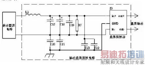 输出直流滤波电路主要用于切断电磁传导干扰沿导线向输出负载端传播,减小电磁干扰在导线周围的电磁辐射。