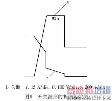 ( 2) 关断时, 图3 中的IGBT 并非是在关断1 个纯感性负载, 而是关断1 个R - L 型负载( 变压器及其负载, 从变压器一次侧可等效为R -L 型负载) ,其电流的下降时间t f 要慢于关断带箝位的纯感性负载。并且, 对于纯感性负载, 只有当IGBT 的集电极电压上升到箝位值后, IGBT 的电流才开始下降( 见图1、图2 中波形) , 而电阻-电感性负载时, 集电极电压和电流几乎是同时变化的( 见图3b 波形) 。