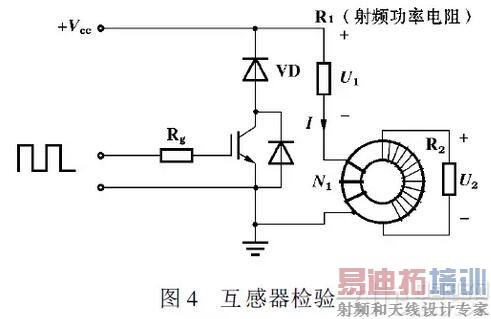 电流测量应使用高频无源电流互感器, 不要使用磁平衡式电流传感器, 前者都有较好的高频响应,后者往往速度较慢, 达不到测量要求。电流传感器要置于被测IGBT 的发射或集电极, 而不要置于主变压器一次侧, 这是2 个不同的电流。这一点可以从图3 IGBT 的关断过程中看出: IGBT1 关断时, VD2 将对关断产生的电压过冲箝位( t1 ~ t 期间) , 在VD2中产生箝位电流。而IGBT1 中电流因转向VD2 而陡降, 此时变压器一次侧电流为IGBT1 和VD2 电流之和, 而非仅IGBT1 中的电流。电流互感器通常由自己制作, 使用前应先检验其性能, 可采用图4 电路进行检验。电阻R1、R2 应使用无感电阻。实际测量时, 互感器初级匝数N 1通常为1 匝, 检验时可适当增加N 1, 这样可以减小检验电流I 而不降低互感器初级的总安匝数, 使检验工作更加容易。比较U2 和U1 波形在延时和畸变方面的区别, 就可确定互感器是否合格。通常U2不能有明显的失真, U2 对U1 的延时应远小于IGBT的开关时间参数。