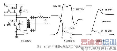 对于PWM 方式工作并使用变压器的开关电源, 其工作情况则与之区别很大。图3 是11 kW 半桥型电路及其工作波形, 使用的IGBT 为