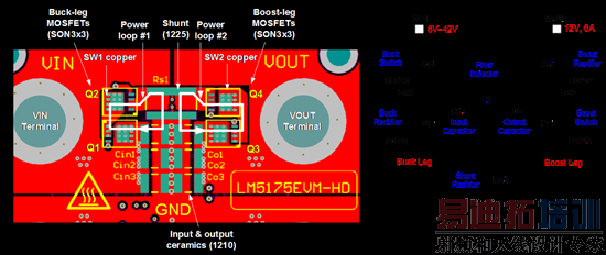 图1:四开关降压-升压型转换器功率级布局和原理图