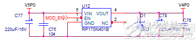 笔者的电路如图1所示,系统12V转为5V,5V转换成3.3V和4V分别供MCU和通信模块。由于通信模块是定时打开和关闭的,使用中发现只要U12(RP170N401B)的使能脚为低电平,系统就能正常工作,在MOD_EN拉高时,整个系统则被复位。