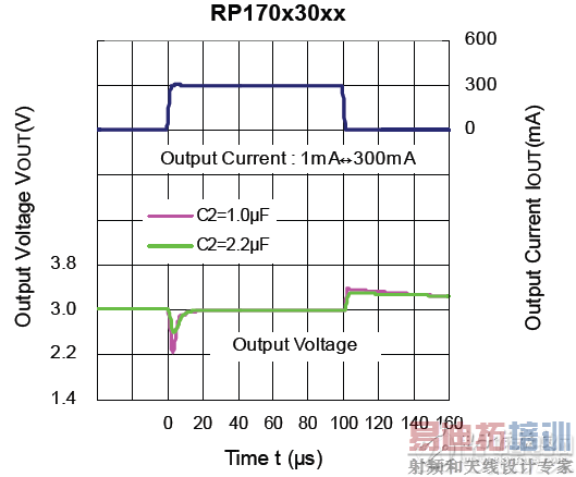 通过查看RP170N401B的器件手册,发现其在负载突然变大时,输出电压由于不能及时调整而有瞬间的跌落。对应到系统中,在使能4V电源LDO使能端的瞬间,因LDO后端有负载,瞬间电流的冲击,使得LDO输入和输出均有一定瞬间压降,系统把12V拉低至9.6V,更严重的是在50us内把5V电平拉低至2.6V以下,4.7V拉低到2.6V以下,引起电源监控芯片706输出复位信号,从而导致文头所述系统重启现象。