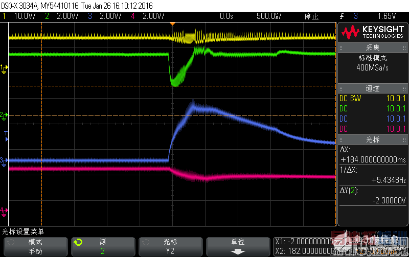 波形分析:图中从上至下依次为12V、5V、4V、3.3V波形,图中3.3V被拉低了184ms,需要进一步看一下5V和4V电源线上的尖峰细节。将以上波形进行放大后,得到如图4所示波形图。