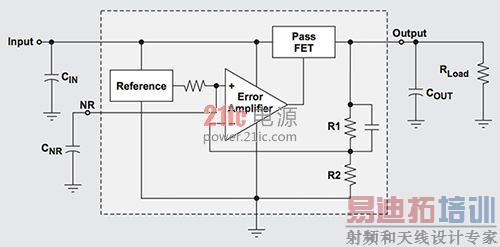 LDO的基本前提是利用一个反馈回路,包括一个基准电压,误差放大器,一个场效应晶体管(FET)以线性模式操作时,和一个电阻分压器。而电阻分压器设定的输出电压时,FET使LDO无论负载,以提供一个恒定的输出电压。误差电路确保输出被维持在所期望的电压。图1示出的LDO的简化示意图。