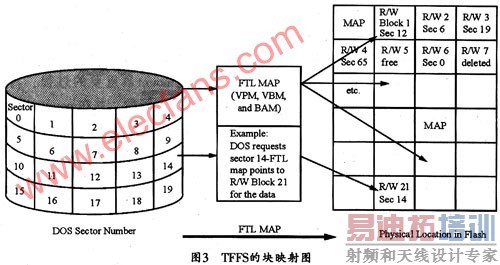 图3中,FTL层将DOS上连续的扇区映射到Flash上某个R/W block块中,同时在某个位置记录一个映射表(称为MAP表),该表中记录了DOS的扇区映射到Flash中的哪个block,当DOS要进行读操作时,FTL首先查询这个MAP,以获得映射信息,然后读取相应的block信息并返回给DOS,从而实现读映射。当DOS需要写入操作时,可能存在将bit0修改为1的情况,于是FTL层将申请一个新的block块,并将新信息写入,然后修改map信息,记录这个DOS扇区已经重新映射了,从而实现写映射。所以,从逻辑上看,FTL层就实现了DOS扇区的映射和FLASH的写入管理。