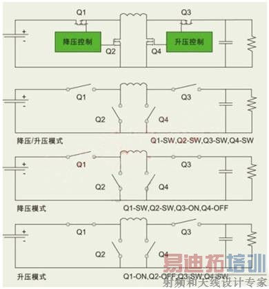 第二款新型降压/升压控制方式在每个开关周期只运行2个MOSFET,从而降低了损耗。从图2可以看出,这种控制方案可以运行于三种不同模式。当Vin大于Vout时,转换器打开Q4并关闭Q3,然后将Q1及Q2作为标准降压转换器使用;当Vin小于Vout时,控制电路打开Q2并关闭Q1,然后将Q3及Q4作为标准升压转换器使用。但这种控制模式在降压与升压模式间的转换区会出现一些运行和控制问题。为解决这些问题,可在转换过程采用标准降压/升压模式。因为在标准降压/升压工作模式下,所有4个开关均处于工作状态,所以能够解决这些控制问题。但开关损耗与RMS电流的提高使得转换区中的效率骤降,而且这个效率骤降区接近电池电压(大部分电池电量在此时提供),所以在电池放电曲线的大部分区域中,转换器工作于低效的降压/升压模式下。
