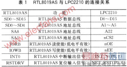 RTL8019AS与LPC2210一般通过外部总线进行连接,其连接关系如表1所列。
