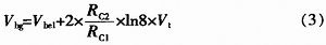 其中I是三极管射极电流,Is与射极面积成正比,n为一常数,取1。这里,取VQC2:VQC1=8:1,因此Is2=8xIs1,又I1=I2,分别代入(1)并相除,整理得: