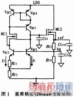 电子镇流器的供电方式为半桥输出接稳压管给芯片供电,其输出电压为高压正弦波(50~100 kHz),加之芯片内数字部分的干扰,这就给芯片的电源带来较大的干扰。因此对芯片内基准的中频PSR(Power Supply Rejection,电源抑制)有较大要求。本文从此角度在Brokaw带隙基准的基础上进行改进,采用LDO与基准的级联设计来增加其PSR。