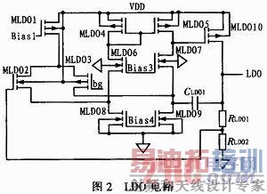 LDO在低频时的PSR主要取决于运放的增益,为此选择折叠共源共栅电路。此LDO电路基于文献中的电路修改,如图2所示,并采用PSR高的偏置生成电路。
