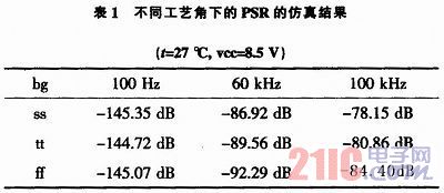 表1为输出电压bg在不同工艺角下的PSR的仿真结果,本电路在不同工艺角下都能在高电源干扰的芯片中正常工作。