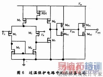 过温保护电路如图5所示。VP信号的电压值是二极管的导通电压,具有1.8 mV/℃左右的负温度系数,因此,随着温度上升它会不断降低。而VN信号几乎不随温度变化。