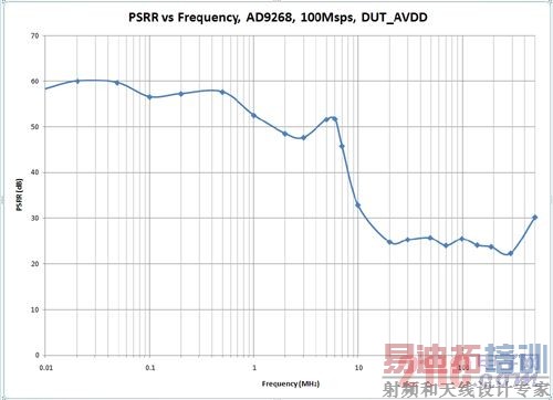 确定高速ADC对电源噪声的灵敏度的一个方法,是将一个已知频率施加于转换器的电源轨,并测量转换器输出频谱中出现的信号音,从而考察其电源抑制性能。输入信号与输出频谱中出现的信号的相对功率即为转换器在给定频率下的电源抑制比(PSRR)。下图显示了典型高速ADC的PSRR与频率的关系。此图中数据的测量条件是将器件安装于配有旁路电容的评估板上,这种方法能够显示典型应用中器件如何响应电源噪声。注意在这种情况下,转换器的PSRR在低频时相对高得多,当频率高于约10MHz时会显著下降。
