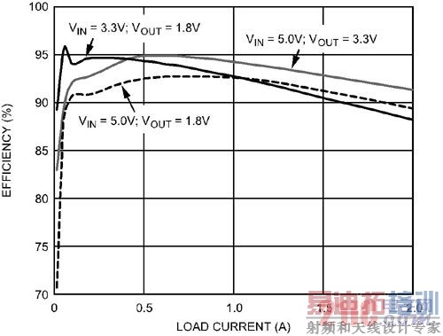传统上,开关调节器不宜用于直接为ADC供电。然而,开关调节器技术已今非昔比,当与后置滤波、精心的设计和布局布线做法相结合,开关调节器可以用作许多高速模数转换器的高效率电源解决方案。如图2所示,开关调节器的效率可达95%,相比于LDO,系统功耗显著降低。对于一个功耗为780mW的1.8V单电源ADC,如果使用开关调节器电源,整体系统功耗可降低640mW或更多。此外,开关电源设计消除了线性级这一热源,PCB的总体热量得以降低,因而对风扇和散热器等额外冷却措施的需求会减少。