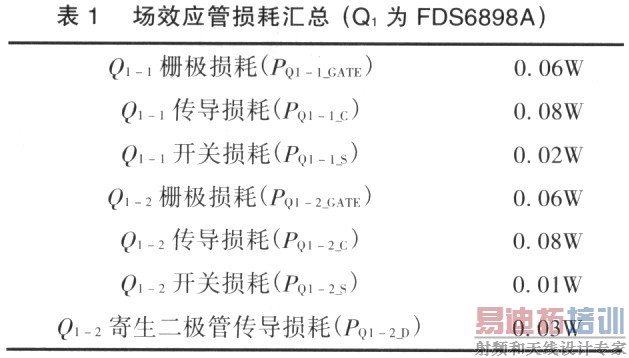 从FDS6898A手册上可查到它最大的结温至室温热阻是78℃/W(θ1A),如果图1电源环境最高温度是45℃,那么Q1工作结温(TQ1J)为72℃(45+78×O.34)。这温度远小于FDS6898A 150℃的结温限制。这里假设Q1被直接焊在2盎司铜层和1平方英寸面积的PCB散热焊盘上。如果需要更进一步降低Q1的结温,可以增加PCB散热焊盘面积或将Q1套上外加的散热器。另外,芯片到散热焊盘的焊接,封装芯片材料,热接触面,热结合性能,可得到的有效散热区域和环境空气流动状况(自然或强制对流)都对场效应管晶片的温升都有很大的关系。实际温度的测量和验证是场效应管热没计的关键。表1是场效应管功率损耗的汇总。