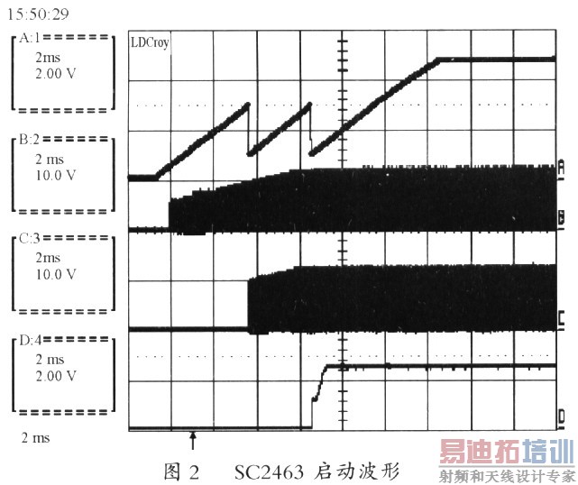 图2中波形A是软启动管脚SS上的电压。波形B是第一个开关转换器的上端场效应管驱动电压(GDIH)。波形C是二个开关转换器的上端场效应管驱动电压(GD2H)。波形D是LDO输出电压(2 6V)。图1中的SC2463电源1.2V输出电压首先建立。随后建立的输出电压是3.3 V。而二组线性稳压的2 6V和1.8V输出电压最后建立。