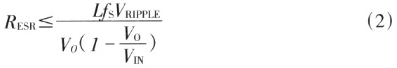 输出电容应按照输出电压纹波和负载动态变化要求来选择。输出电感产生的纹波电流会在输出电容等效串联电阻(ESR)上产生输出电压纹波(VRIPPLE)。为了满足输出电压纹波要求,输出电容等效串联电阻(ESR)必须满足式(2),即