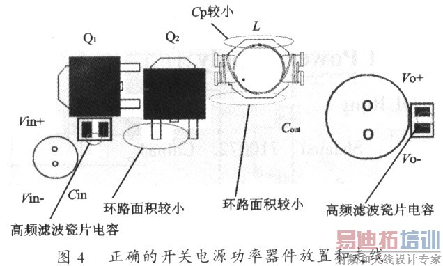 图4是一个比较好的电源功率电路PCB走线。CIN一Q1-Q2和Q2-L一COUT环路的面积已控制得最小。上端场效应管(Q1)的源极,下端场效应管(Q2)的漏极和输出电感(L)之间的连接点是一整块铜片焊盘。由于该连接点上的电压是高频电流,Q1和Q2和L需要靠得非常近。虽然输出滤波电感(L)和输出滤波电容(COUT)之间的走线上没有高峰值的高频电流,但比较宽的走线可以降低直流阻抗的损耗使电源的效率得到提高。如果成本上允许,电源可用一面完全是接地层的双面PCB。但必须注意在地层上尽量避免走功率和信号线。在电源的输入和输出端口还各增加了一个瓷片电容器来改善电源的高频滤波性能。