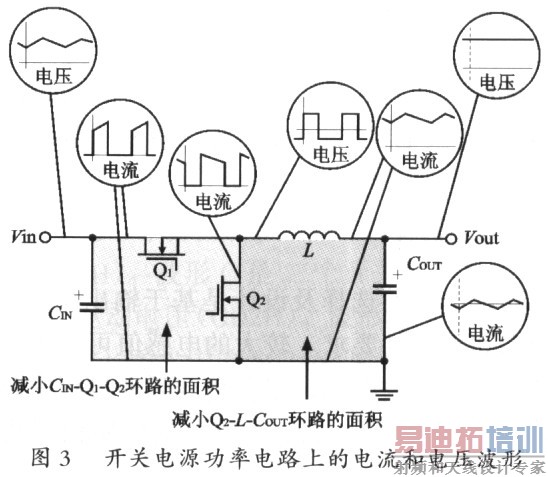 电源功率器件在PCB上的正确放置和走线将决定整个电源工作是否正常。设计人员首先要对开关电源功率器件上的电压和电流的波形有一定的了解。图3更进一步显示了一个降压式开关电源功率电路元器件上的电流和电压波形。由于从输入滤波电容(GIN),上端场效应管(Q1)和下端场效应管(Q2)中所流过的电流是带有高频率和高峰值的交流电流,所以要尽量减小由GIN一Q1一Q2所形成的环路面积。同时由下端场效应管(O2),电感(L),和输出滤波电容(COUT)所组成的环路面积也要尽量减小。
